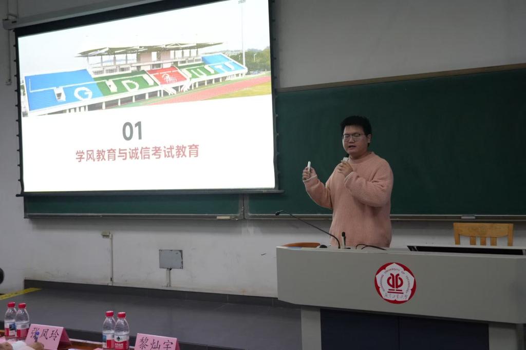 辅导员黎灿宇针对学风问题与诚信考试进行专题教育,从关注考试信息、重视文化课学习与绩点、积极参加校内活动等方面提出要求。解读《学生手册》中考试违纪处分规定,并结合学校过往作弊案例,告诫同学们坚守诚信底线、踏实备考。